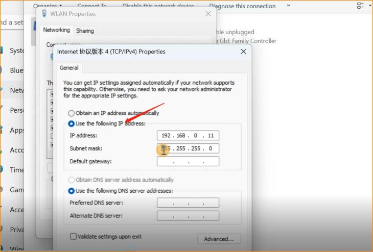 Step2:We check our Gateway ip 192.168.5.1,but this aps default ip:192.168.0.X .them donnot keep the same network segment.We cannot login the Web UI of AP. we should modify to the same network segment between ap and pc. Click WLAN and go to properties>Internet Protocol Version 4 TCP/IPv4,change to Use the following IP address。Enter IP address 192.168.0.X, and Subnet mask :255.255.255.0. Save.
