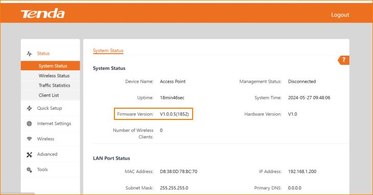 Click system status,then you can see the Firmware version number.