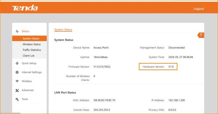 Step5: We can check the version of device from Status. Click system status,then you can see the Hardware version number.