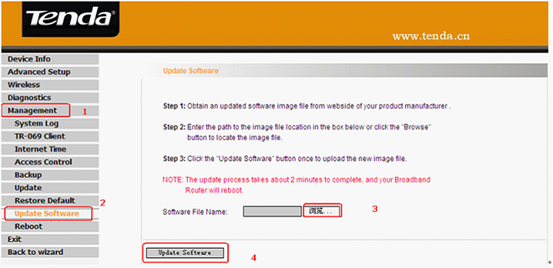 4. Click Management->Update Software on the left side, then click Browse to locate and select the firmware file, then click Update Software to upgrade. The router will reboot after upgrading.