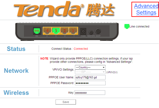Note: If you have consulted your ISP and confirmed the connection type is PPPOE, you can set W150DD/W300D in a fast way with the followings steps: select your country and VPI/VCI , input your internet access account and password into the blanks, set a password for wireless network and hit on save. Generally, you can access internet now if you refresh this webpage several times until it shows connected. If you have no idea, just go to advanced settings.