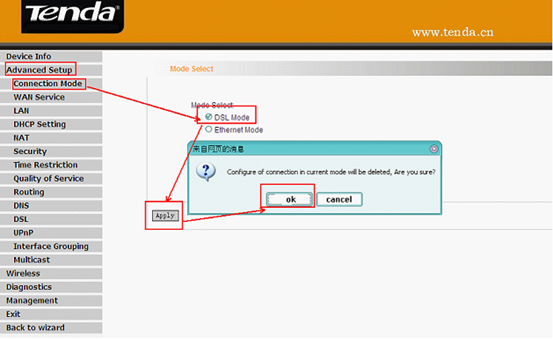 4. Click Advanced Setup first, then click connection Mode, check DSL Mode and click Apply. It will reboot if you change the mode form Ethernet Mode.