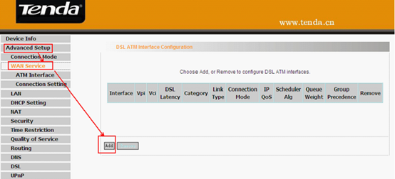 5. Then go back to Advanced Setup and choose WAN Service.Then click ATM Interface and click Add to add a new setting.