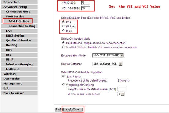 6. Then set the correct VPI/VCI value from your ISP (Internet Service Provider) and then select the DSL link type. If you don’t know, please ask your ISP. When you have selected the right type, click on Apply/Save.