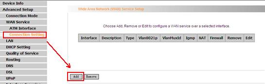 7. Please click WAN Service first, then click Connection Settings and click Add to add a new connection.