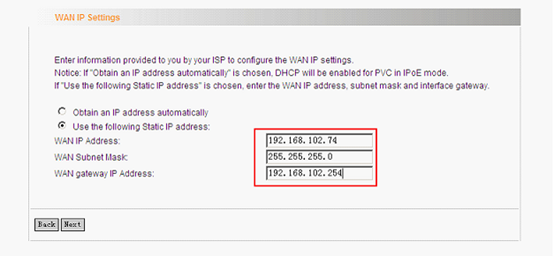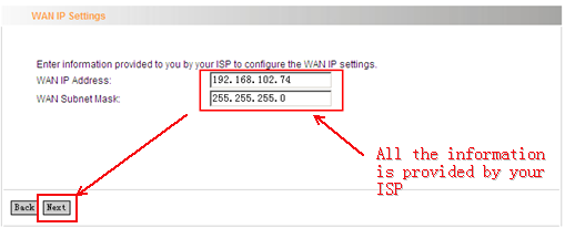 Input the WAN IP Address and WAN Subnet Mask given by your ISP. Click on Next to continue.