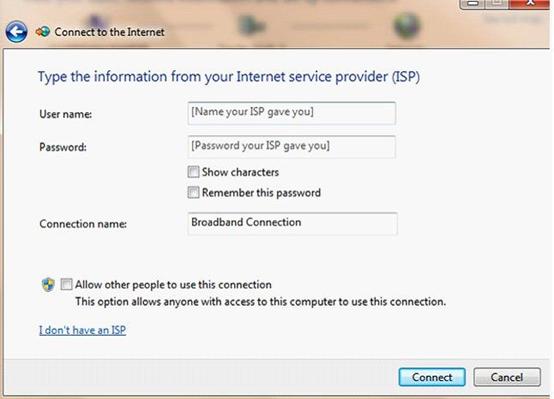 Type in the User name and password given by ISP, and click Connect.