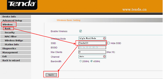 1. Click on Wireless first then click Basic , please change SSID (it’s the name of your Wi-Fi) to another name, only numbers or letters can be included in, and select the channel to be channel 6(or channel 1, or channel 11) then click on Apply.