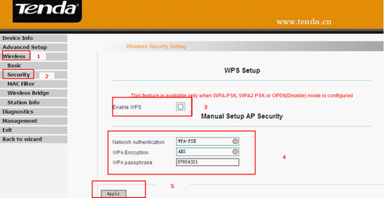 2. Click on Security under Wireless, please don’t check Enable WPS. Select Network Authentication to be WPA-PAK and select WPA Encryption to be AES. Set a password for your wireless network in the blank of WPA passphrase (at least 8 numbers or letters).Next, go to V.