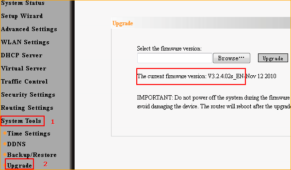 Step 3 Click on System Tools, then click on Upgrade and check the current firmware version.