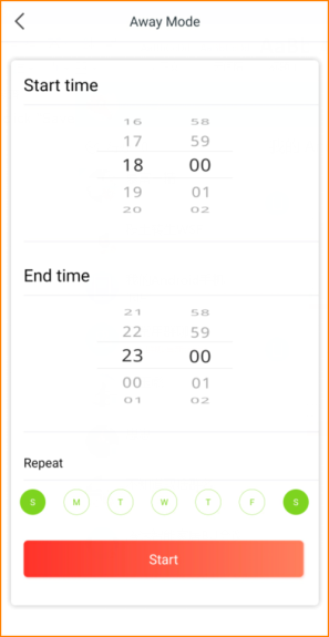Take the picture below for example, the SP3 will turn on the Away mode between 18:00 o’clock to 23:00 o’clock only on Saturday and Sunday. During this period, the device would turn on/off randomly to act like there’s someone at home, so that you can Make your house safer.