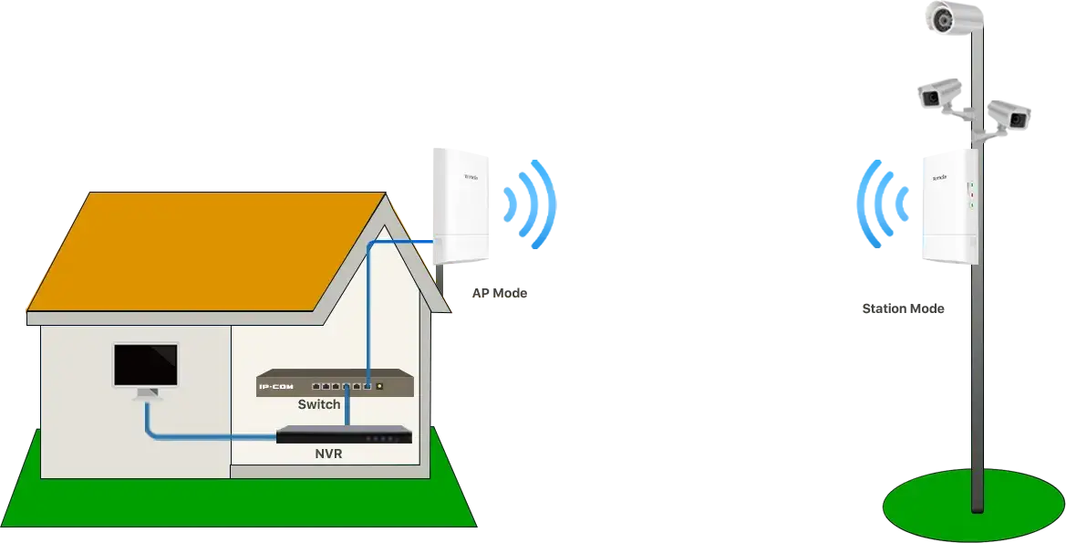 Uno funciona como modo AP y otro funciona como modo Estación para crear una conexión inalámbrica de larga distancia para videovigilancia.