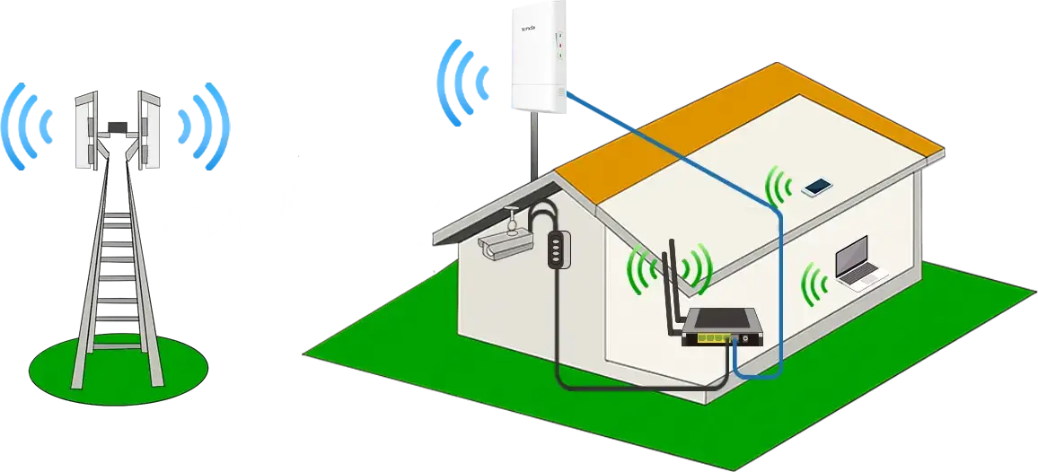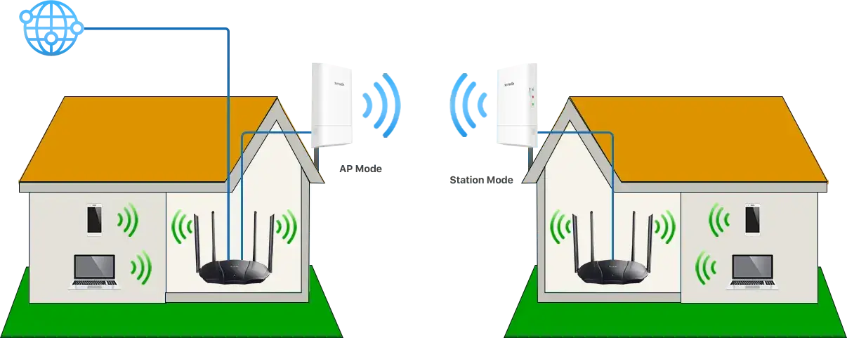 Uno funciona como modo AP y otro funciona como modo Estación para crear una conexión inalámbrica de larga distancia para compartir Internet entre edificios o vecinos.