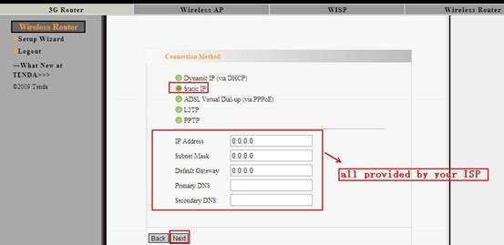 (2) If your connection type is Static IP, please input the IP address, Subnet Mask, Default gateway and DNS provided by your ISP, then click Next to continue;