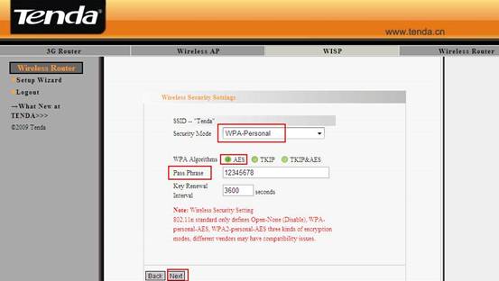 5. Then you are in the Wireless Security Settings page where you can set a password for your network. Please select WPA-Personal as the security mode and AES as the WPA Algorithms, then input at least 8 characters, numbers of letters, in the Pass Phrase. Click Next.