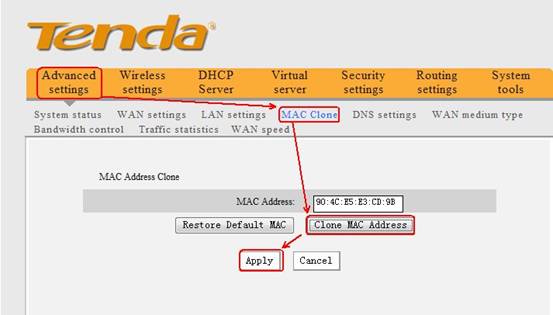 2, click Advanced SettingsàMAC Clone, then click Clone Mac Address to clone your computer’s MAC address to the router’s WAN Port. Then Click Apply to save the Setting and the router will reboot.