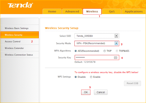 4 Click Wireless, then click Security and choose the Security mode as WPA-PSK, set a