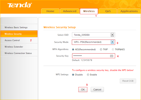 4 Click Wireless, then click Security and choose the Security mode as WPA-PSK, set a