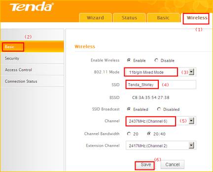 1 Click on Wireless, then click on Basic and making sure that wireless is Enable. Then open the drop down menu of the 802.11 mode option and choose the mode as 11b/g/n mixed mode. Also you can change the SSID (wireless name) as you want. On this page you can choose the Channel and the Extension Channel will be selected automatically after choosing the Channel. Then let the other settings as defaulted, then click on Save to save the settings.