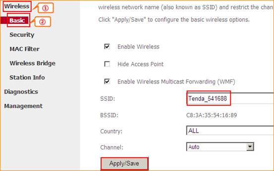 1 Click on Wireless and Basic, then you can change the Primary SSID as you want. Click on Apply/Save to save the settings.