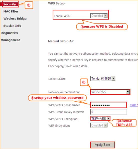 2 Click on Security, make sure that WPS is Disabled,choose the mode as WPA-PSK (recommended) ,input your wireless password, and choose TKIP+AES .Click on Apply/Save to save the settings.