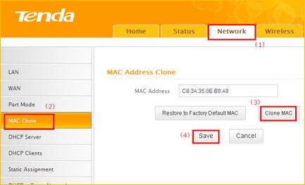 a, click networkàMAC CloneàClone MAC to clone your computer’s mac address to the router’s WAN port, then click Save to save the setting and click Reboot.