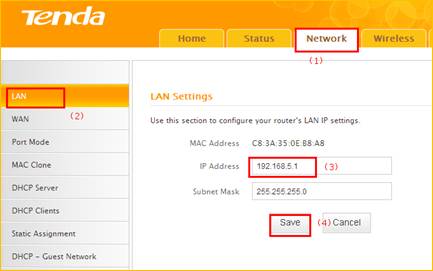 b, click NetworkàLANàIP address, change it to 192.168.5.1, click Save to save the setting and the router will reboot automatically.