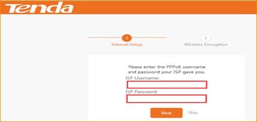 3 Choose thePPPOE option,then type the ISP Username and ISP Password in the correct bars, then click onNext.