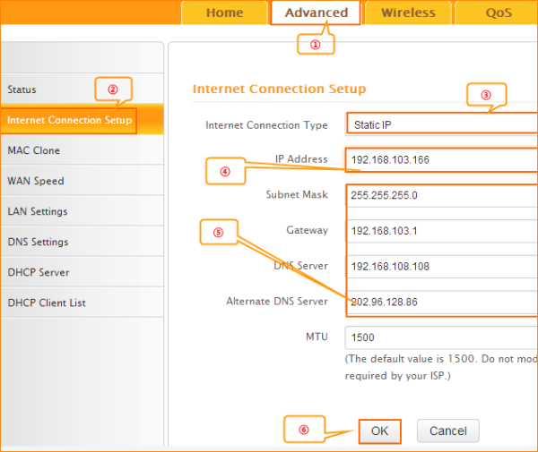 3.1.4 Click on the Advanced then click on the Internet connection setup option on the left of the page, then open the Dropdown Menu of the Internet Connection Type then choose the Static IP option, after that type the accounts that provided by your ISP then click on Ok to save the settings.
