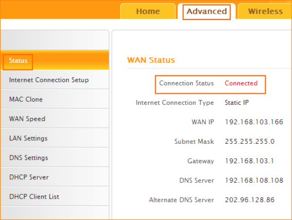 4.1 Click on Advanced to login the advanced setting page, then check the Status if the Connection Status shows Connected that means you can access internet, please check.