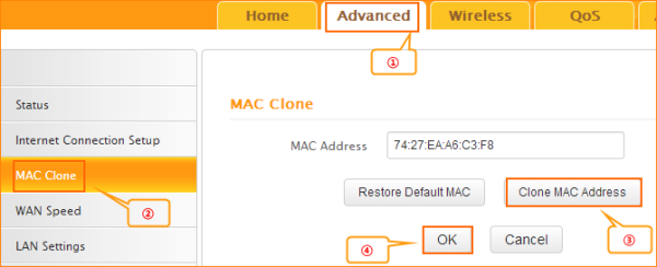 A: Click Advanced——MAC Clone——Clone MAC Address to clone your computer’s MAC address to the router’s WAN port, then click Ok to save the setting and click Reboot.