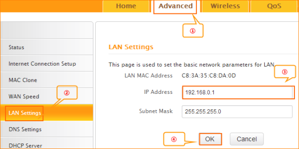 B: Click Advanced——LAN Settings ——IP address, change it to 192.168.10.1, click Ok to save the setting and the router will reboot automatically.