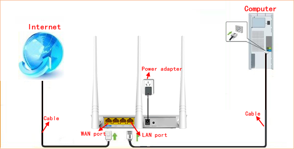 Connect the Ethernet cable with the WAN port of the router, then connect your computer with one of the LAN ports of the router by a cable.