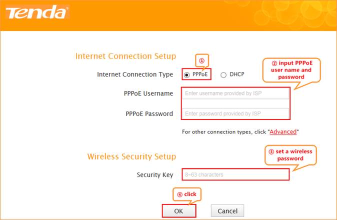 3 Choose the PPPOE option, then type the ISP Username and ISP Password in the correct bars, then set a Security key as you want, click on Save to save the settings, then click on Advanced to login the advanced setting page.