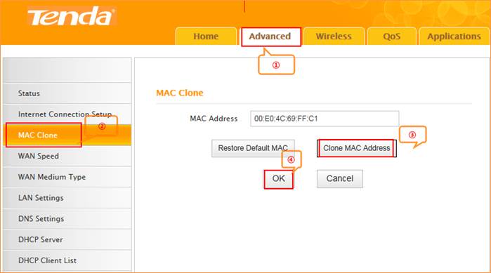 a, click AdvancedàMAC CloneàClone MAC Address to clone your computer’s mac address to the router’s WAN port, then click Save to save the setting and click Reboot.