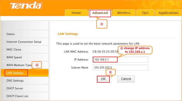 b, click AdvancedàLAN SettingsàIP address, change it to 192.168.5.1, click Save to save the setting and the router will reboot automatically.