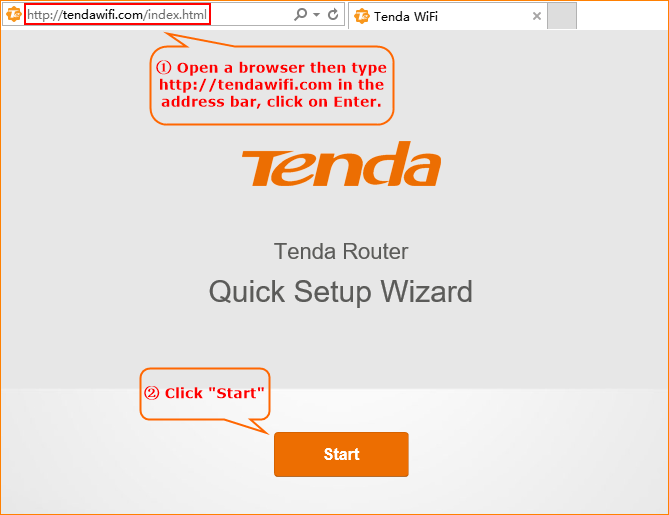 1.Open a browser then type http://tendawifi.com in the address bar, press Enter. And go to the homepage of the router. Then click “Start”.