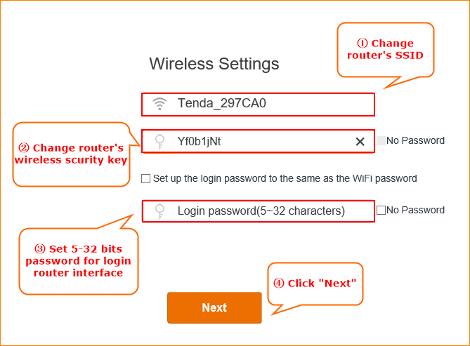 3.Setup the wireless name and wireless password. You need to set a login password as well. Then click on Next.