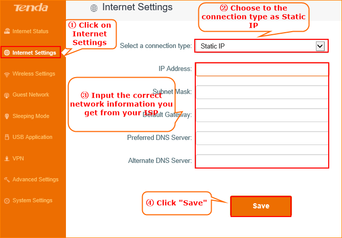4.Click on Internet Settings, select the connection type as Static IP. Then input the related network info that your ISP gives you. Click Save.