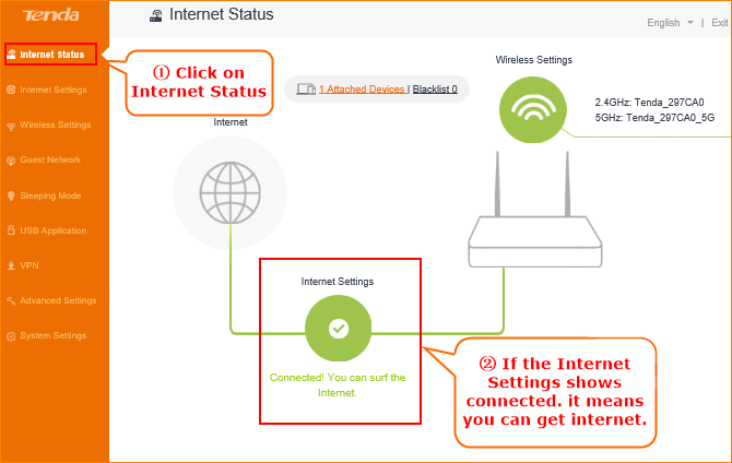 1. Click on Internet Status, if it shows Connected, means you can get internet. Enjoy it.