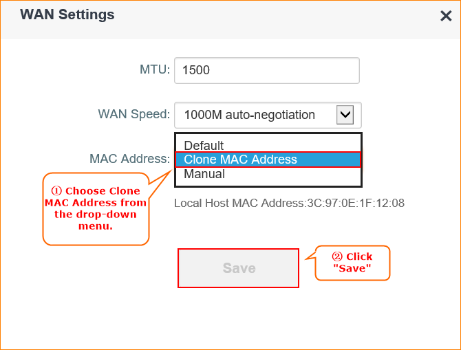 2.In WAN Settings, please choose Clone MAC Address in the drop-menu. Then click Save.