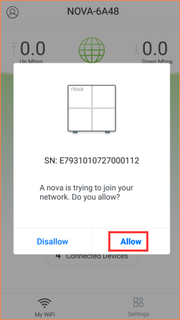 4. Then lights turn to blinking blue, open APP and check whether it will pop a window that a new nova unit is joining the current network system. Tap “Allow”.