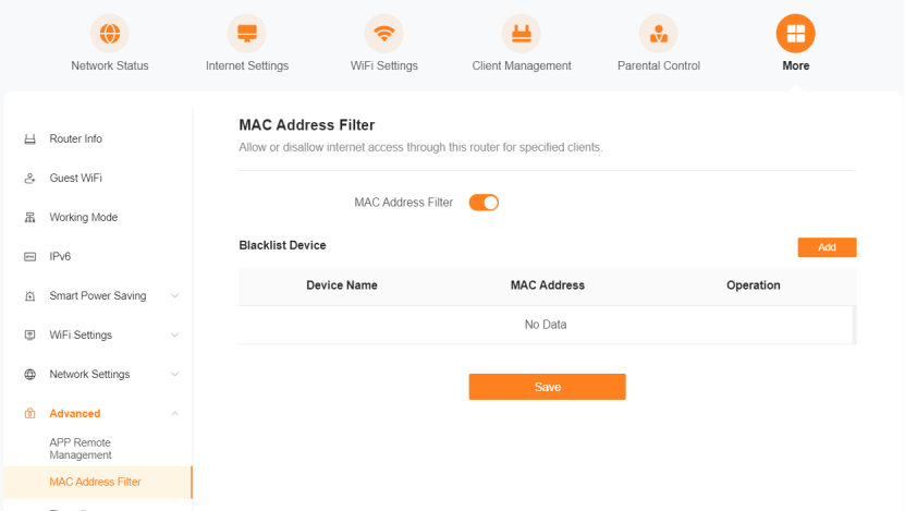 ① Log in to the management interface using a device that can connect to the router, and check whether the blacklist and whitelist restriction (MAC address filtering) is enabled.