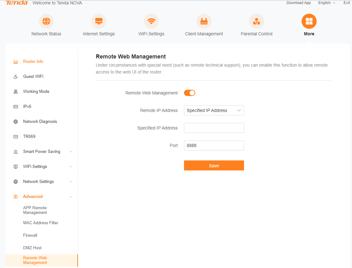 To access the configuration page, log in to the web UI of the Mesh device, and choose More > Advanced > Remote Web Management. By default, this function is disabled. When this function is enabled, the page is shown as below.