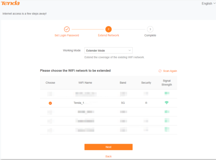Set the Working Mode of the WiFi extender as Extender Mode, select the WiFi network you want to extend, and then click Next.