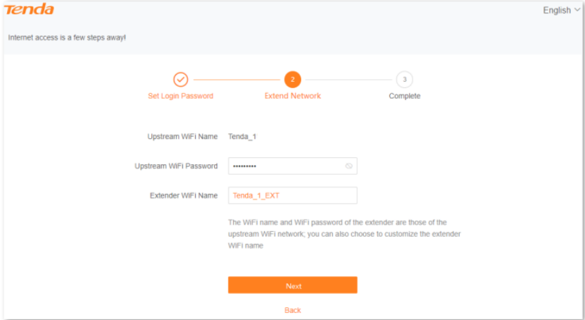 Enter the WiFi password of the WiFi network you selected, modify the extender WiFi name, and then click Next.