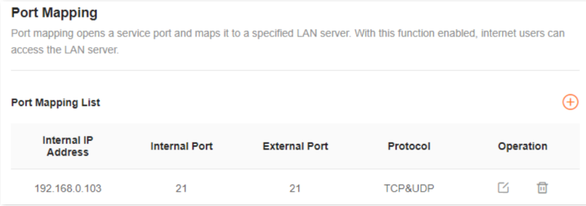 With this function, you can map an external port to an internal port, so that applications using the internal port (such as a web server) are accessible from the internet.