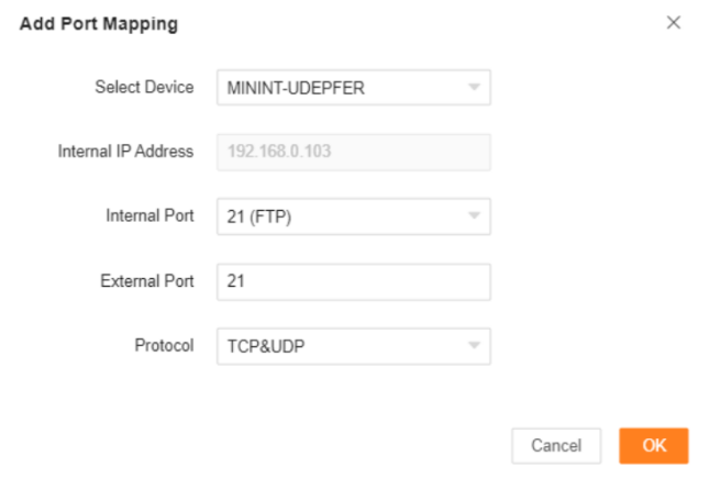4 Select your computer for Select Device, 21 (FTP) for Internal Port, and TCP&UDP for Protocol.