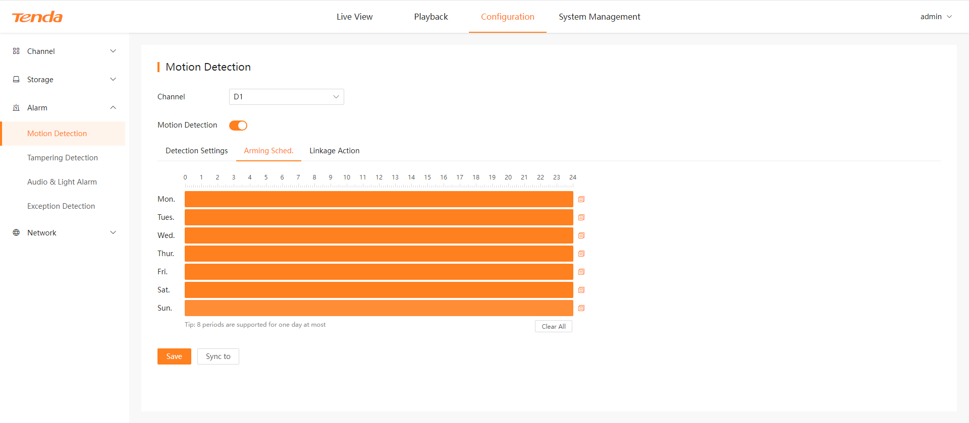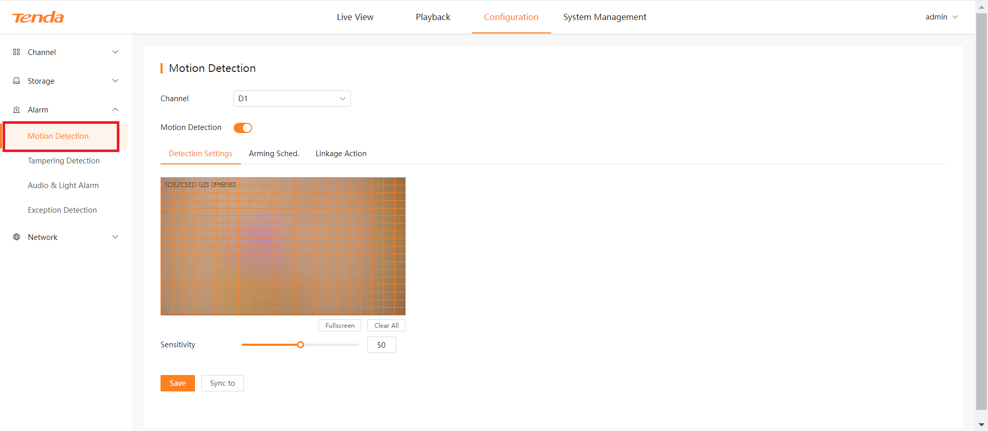 Click Configuration-Alarm to enter the alarm configuration interface, and click Motion Detection to configure. In the detection settings, you can adjust the camera's detection range and sensitivity, in Arming Sched, you can set the alarm schedule, and in linkage Action, you can set the alarm linkage action,such as monitor pop-up window, email sending, message notification, etc.