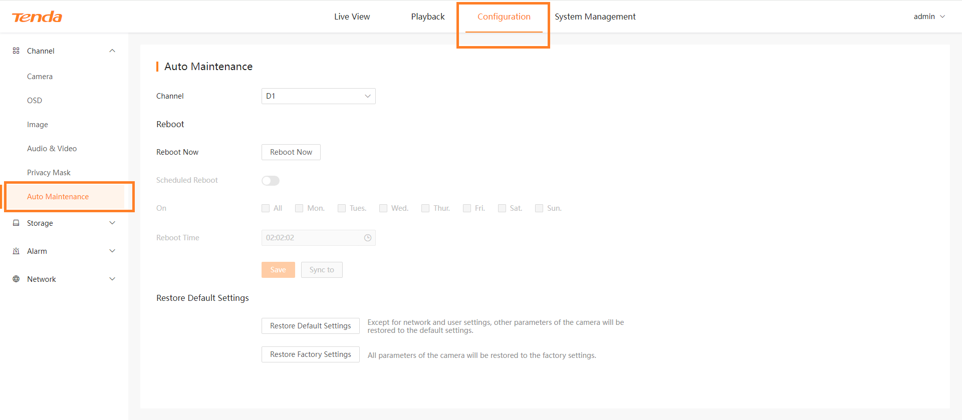 3. Scheduled restart: After logging into the web interface, click Configuration-Automatic Maintenance. On the right, you can select the time and schedule you want to restart and then click Save.